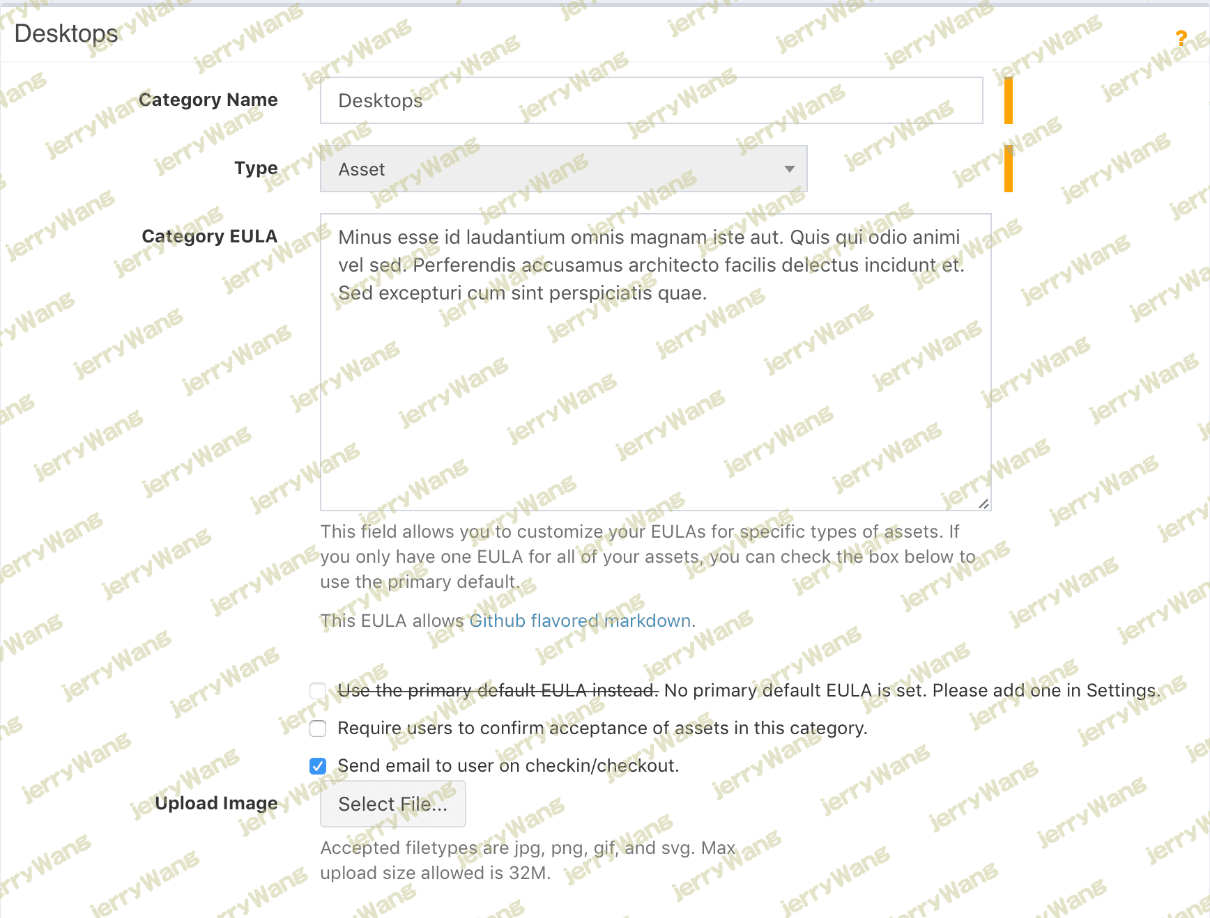 类别很重要,因为它们包含资产和属于它们的附件所继承的属性,例如是否已将项目签出给终端用户,是否向最终用户发送电子邮件,是否要求用户单击链接证明他们已经收到资产或附件,以及是否应该向用户发送电子邮件EULA。