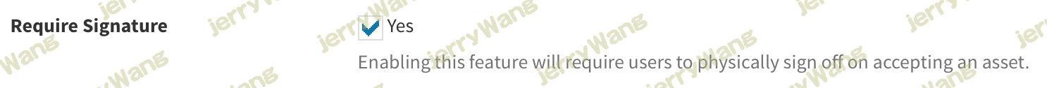 从版本3.6.0开始,您可以要求资产带有资产接受/拒绝的物理签名。启用此功能后,系统将在屏幕上提示用户,提示他们可以在任何启用触摸的设备上用鼠标或手指签名自己的名字。