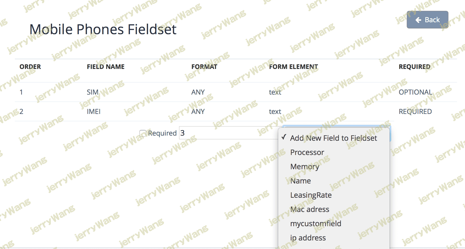 将字段添加到字段集中时,可以选择是否需要该字段,字段应以什么顺序显示,然后从选择框中选择要添加的字段集。