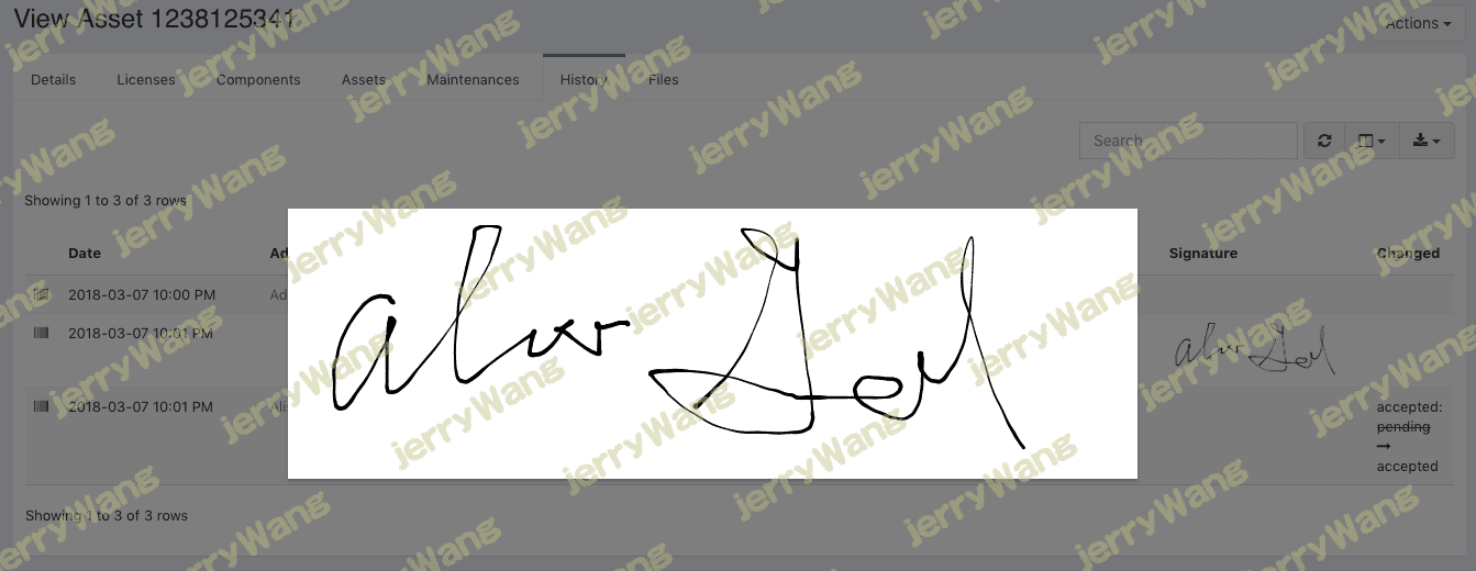 一旦可见,资产历史记录选项卡将显示已签名接受资产的所有用户的签名。