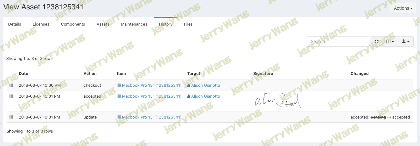 要查看验收签名,只需转到资产的“历史记录”标签。(您可能需要使用列选择器显示该列。)